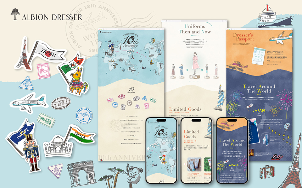 アルビオンドレッサー10周年を記念し、お客さまへの感謝を伝える特別サイトをブランディング。「旅」をテーマに、世界中を旅する設定で各国に合わせたイベントやプレゼントの告知、ブランドの歴史など1年を通して更新。お客さまが「次はどの国だろう?」とワクワクしながら楽しんでいただけるデザインを目指しました。